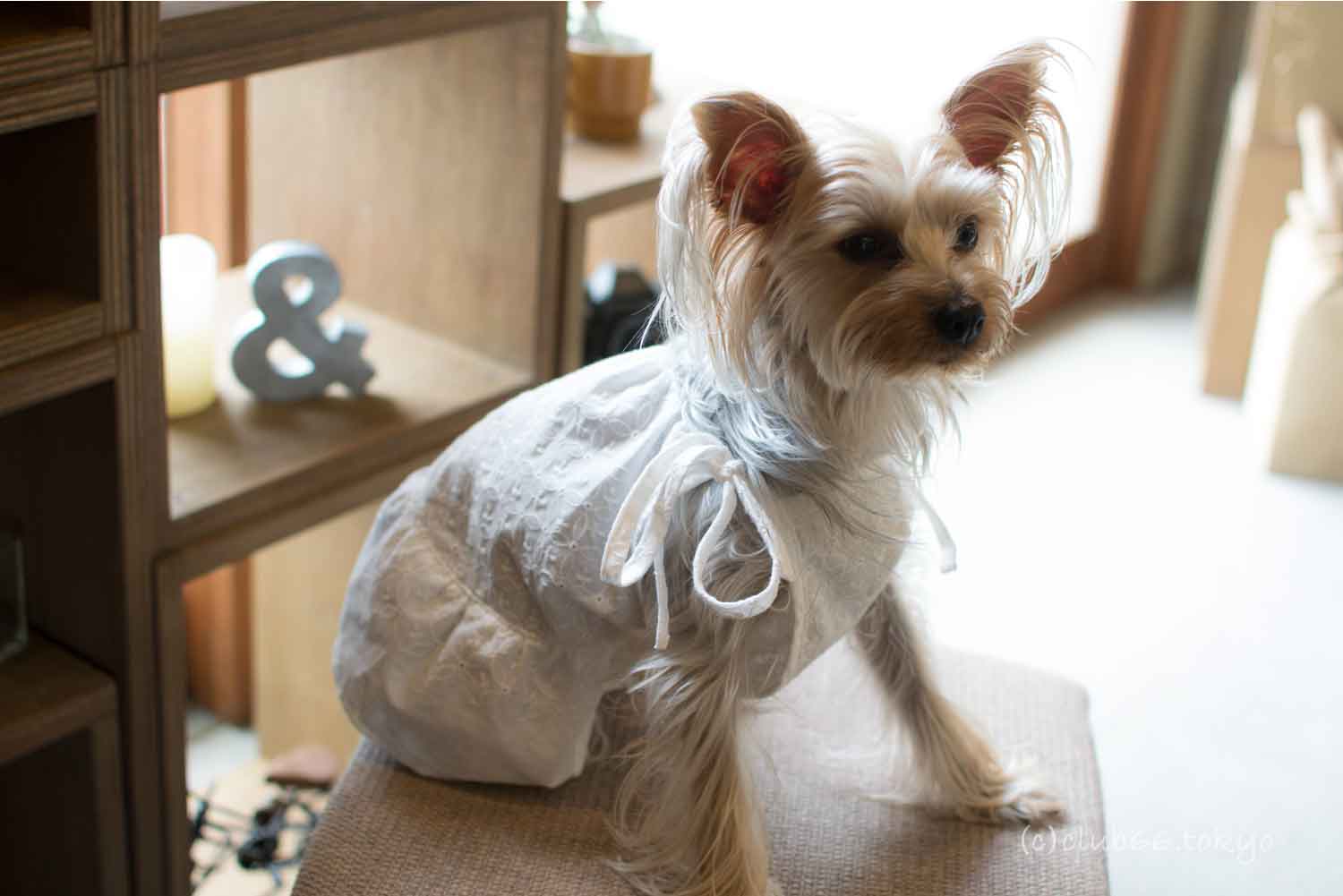 そもそも私の幼いころの犬たちは外で飼われている雑種犬が多く、室内犬を飼っているお宅は特別で、うらやましかったのを思い出します。それゆえに、わんちゃんが服を着ている姿をみたことがなく、初めて犬の服売り場にいったときに違和感を感じていました。しかしながら、イギリスのヨークシャー地方のヨーキーちゃんは冬の寒さに弱く、寒い冬は外にでるとガタブルでこれは何とかしなくては、というところから洋服探しを始めました。