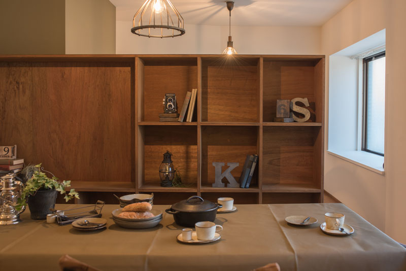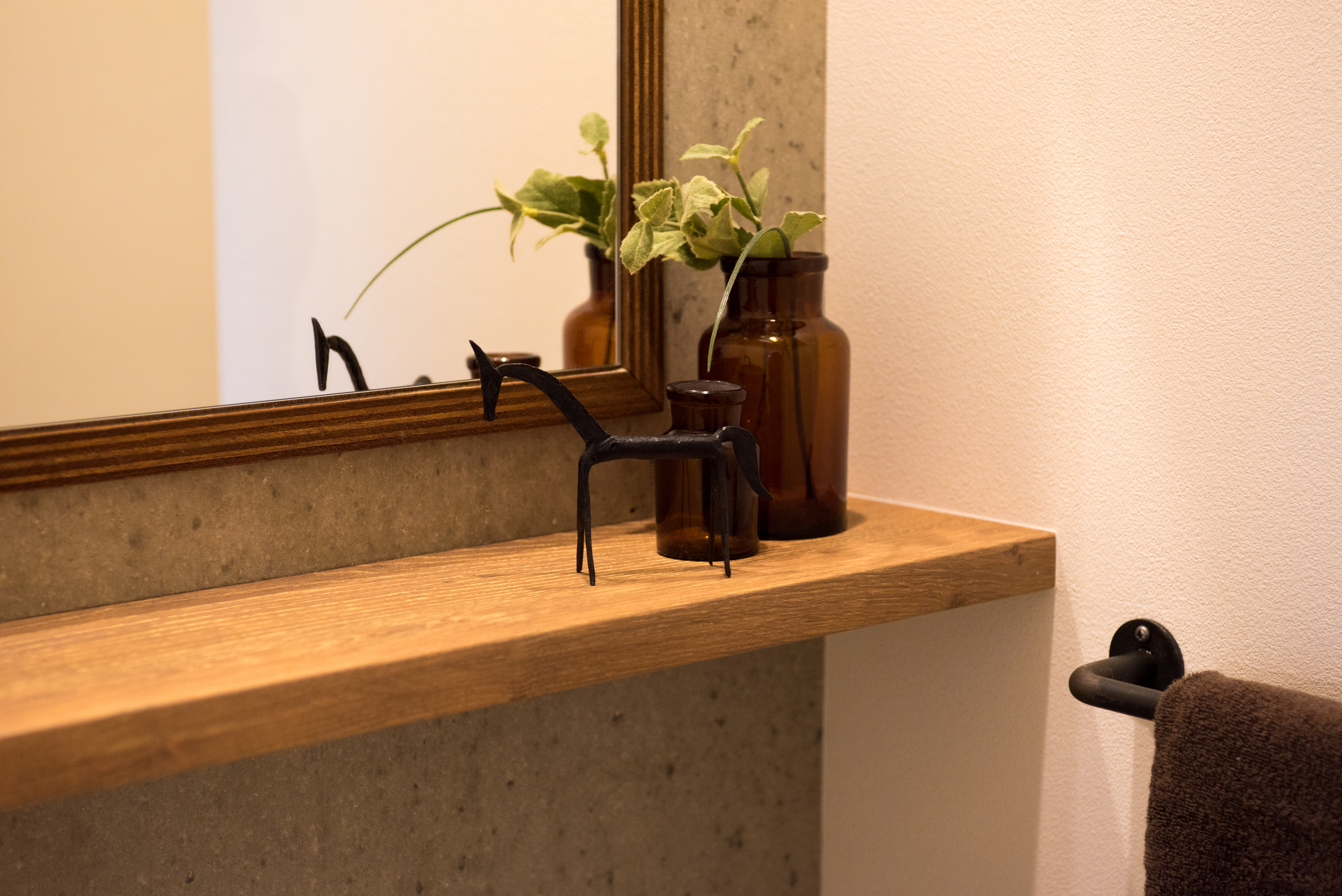工事が終わったあとの何もない棚に、撮影用にちょっとした小物やグリーンを置きました。生き生きとした表情に生まれ変わりますよね! 飾り方に決まりはないですが、いくつかのポイントをおさえればディスプレイがぐっと引き立つと思います。まず、テーマを決めます。分かりやすいところですとクリスマスやハロウインといった季節のイベントでしょうか。それぞれに相応しいアイテムを選びます。他には選ぶ素材のカテゴリーや色を意識したり・・・ガラスのような爽やかな感じなのか、麻のようなざっくりした質感なのかです。色も同系色やトーンを合わせるとうまくいきますよ。飾るときには、小物たちを魅力的に見せられるように配置しましょう。 私が飾る時に意識するのは、小物たちと空間の関係です。例えば、一枚の棚に飾る時は小物同士のバランスもですが棚の空白の部分とのバランスも大事になってきます。アイテムにもよりますので、置いてみてしっくりする位置を見つけます。
